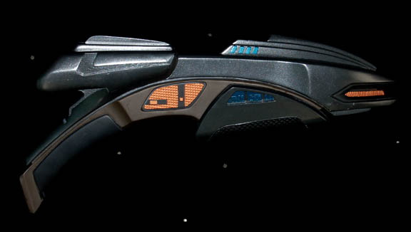 A solid cast resin prop Romulan disruptor rifle made for Star Trek: Deep Space Nine painted metallic pewter with black, metallic copper, and green accents. The sides of the prop feature green painted ‘Romulan' character letters and the item measures approx. 19 X 2.75 X 9 inches. Several were used … |