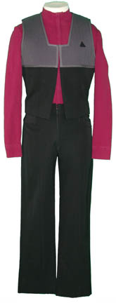 Made for Captain Picard (Patrick Stewart) this Commando Style uniform was seen in 'Star Trek VIII - First Contact'. The outfit includes a black and grey Starfleet vest and black pants. The burgundy shirt included in this ensemble was worn by Patrick Stewart's stunt double. |