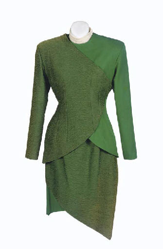 A two-piece suit, comprising: an emerald green jacket with geometric front-fastening of textured green cotton, with matching skirt, and a pair of boots - worn by Susan Gibney as Dr. Leah Brahms in "Booby Trap" in <I>Star Trek: The Next Generation</I>; with corresponding wardrobe tag (4) |