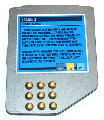 A sturdy PADD (Personal Access Display Device) made from high quality cast resin featured in the episode “Cold Station 12” painted metallic pewter with applied gold painted rubber accent ‘buttons' and an application graphic depicting ‘Lesson 21, Dr. Soong’ and an essay on why ‘augments’ are superior to homo sapiens, … |