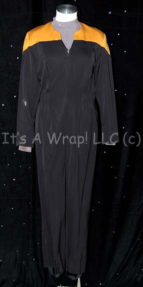 A costume featured in various episodes of Star Trek: Voyager. This Starfleet uniform jumpsuit is for wear by Christine Delgado in the role of “Lieutenant Susan Nicoletti”, it is black with Operations Gold division shoulders that zips up the front, clasps at the top, and features a Velcro patch on … |