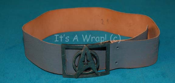 A specially crafted Starfleet themed belt appearing rarely in Star Trek I: The Motion Picture on background performers portraying Starfleet technicians. The item is a tan leather belt with a gray painted side and snap size adjustment ends and a pewter colored metal buckle with a centered feature films era … |