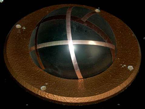 A plastic dome with metallic copper strip applications crisscrossing and a metallic copper painted MDF (micro density fiber board) mount. Items like this made appearances in multiple episodes of Star Trek beginning in The Next Generation typically on Ferengi ships, later in Enterprise on Orion vessels. Usually they were affixed … |