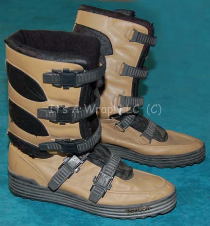 A pair of Reebok brand name thermal boots featured in Star Trek V: The Final Frontier for wear by “USS Enterprise-A” security personnel wearing commando style uniforms on the hostage rescue mission to Nimbus III. The boots are tan colored with black plastic zip straps, black thermal interiors, and blacked … |