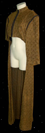 Featured in the Star Trek: Deep Space Nine episode “Inter Arma Enim Silent Leges” during scenes involving the ‘Romulan' Continuing Committee, this full length over dress is made to be worn on the shoulders and arms. It features a gold patterned fabric with a black nylon interior and snaps and … |