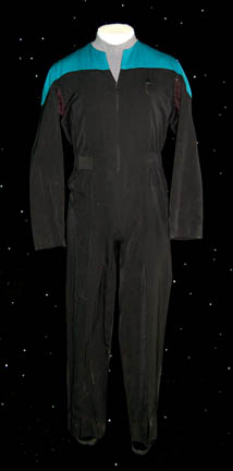 A costume featured in the Star Trek: The Next Generation episode “The Outcast”, wherein “Commader Riker” (Jonathan Frakes) falls in love with a member of a species called the “J'Naii” which does not recognize genders. This costume is a long-sleeved, full-length, brown suede jumpsuit with tan piping, wraps on either … |