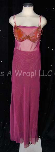 Four costumes, comprising: a skirt, a long-sleeved cropped top, bra and pants of orange stretch nylon seen in Picard's first meeting with Vash on Risa, a sheer pink gown worn over a bathing suit (not included), also worn on Risa, a strapless dress of textured nylon from Vash's attempted escape … |