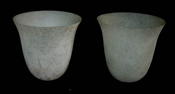 This pair of lampshades was used as set dressing during the filming of Star Trek episodic television. Made of opaque glass, each bell shaped shade has had a rough earthy texture applied to its surface. Each shade measures approx. 7 ½ x 8 inches diameter. |