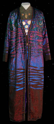 | A costume featured in the Star Trek: Enterprise episode “Oasis” in which the crew of “Enterprise” locates a crashed alien ship populated by holographic survivors. This two piece costume is a gray full length jumpsuit with a stretchy blue crimped fabric chest and a matching costume coat with similar sleeves. … |