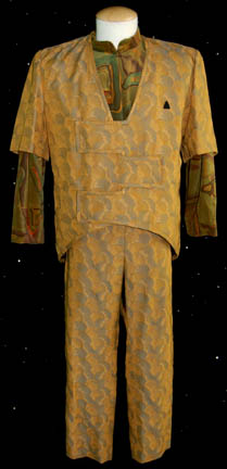 A costume featured in various episodes of Star Trek: Voyager episodes such as “Parturition”. This costume is for wear by Ethan Phillips in the role of the Talaxian Morale Officer and Renaissance Man “Neelix”; and consists of a long-sleeved, olive-colored shirt featuring a pattern of multi-colored geometric shapes, a short-sleeved … |