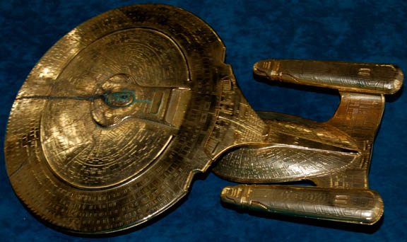 A prop model of the “USS Enterprise-D” made for use during Star Trek VIII: First Contact. The item is a plastic molded model with a metallic gold finish applied across its entire exterior surface with a bracket for mounting to a wall. Measures approx. 19 x 13 ¼ x 3 … |