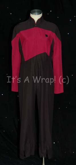 A costume featured in various episodes of Star Trek: The Next Generation. This costume is a Starfleet uniform jumpsuit featuring black shoulders, a Command Red chest, back, sleeves, and piping around the Mandarin collar; a black waist and legs that end in stirrups. This particular uniform has a zip down … |