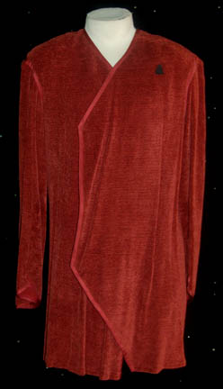 A soft red robe with a double breasted appearance featured in the Star Trek: Voyager episode “Riddles” for wear by “Tuvok” (Tim Russ) who lost his ability to retain his ‘Vulcan' emotional control and was subsequently relieved of duty until a cure could be found. The interior Voyager tag reads … |