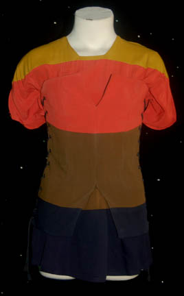 Featured in the Star Trek: Voyager episode “Fortunate Son”, this sexy V-neck dress is orange with black trim. A thigh length split up the left leg reveals the chic black lining. Costume comes complete with costume tag indicating wear by “Reba Shaw Alexander”. |