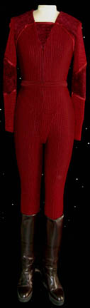 A full length gray uniform jumpsuit that zips up the front with command red quilted shoulders and division trim at the cuffs featuring a form fitting elastic waist with loops for ‘away team' gear, black detachable shoulder pads, sewn on closed flap pockets on the thighs, black elastic stirrups at … |