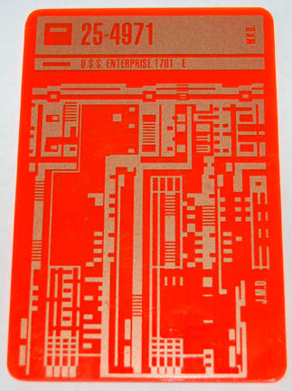 A clear orange Isolinear-style data module as featured in Star Trek: First Contact, Star Trek: Insurrection and Star Trek: Nemesis. It was almost certainly used as a prop/set dressing on “Captain Picard's” (Patrick Stewart) Ready Room desk onboard the U.S.S. Enterprise-E. Made of acrylic, the module has silk screened surfaces; … |