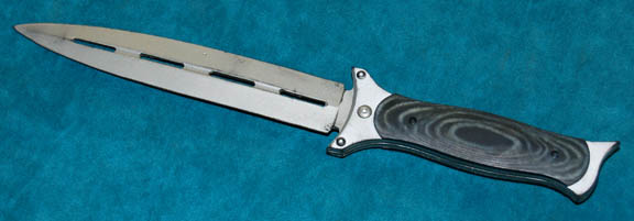 A prop rubber knife featured in the Star Trek: Enterprise episodes “In a Mirror, Darkly: Parts I and II”. The item is molded rubber painted metallic silver with a black painted grip and a faux wood finish. The item measures approx. 12.5 X 2 X 1.5 inches. |