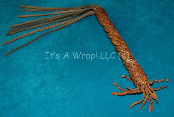 A leather bound flail believed to have appeared in Star Trek episodic television. The item is a braided leather wrapped wooden handle with thick wool strips affixed to the end for stunt use. The item measures approx. 17 X 2 inches diameter with 19 inch flails. |