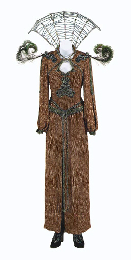 A black gown covered with copper beadwork, sequins and elaborate black metallic bead trim; a high beaded plastic collar piece, black shoes with sequins, feathered shoulder pieces, and other accessories with corresponding costume and makeup notes -- worn by Kate Mulgrew as Captain Janeway playing Queen Arachnia, "The Bride of … |