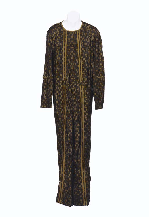 A loose jumpsuit of black and gold checked cotton - worn by Matt Frewer as Professor Berlinghoff Rasmussen in "A Matter of Time" in <I>Star Trek: The Next Generation</I>; with corresponding wardrobe tag |