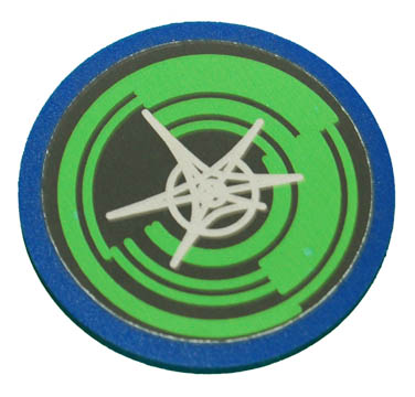 This green Xindi simulated control button came off of a Xindi console from Star Trek: Enterprise. Made of blue plastic, the ‘button' has a green patterned sticker that gives it a Xindi appearance. Measures approx. 2 inches diameter. |