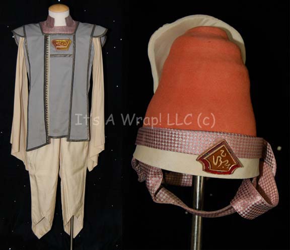 A costume like those featured near the end of “The Search for Spock”, the beginning of “The Voyage Home”, and various instances in other episodes and films. This costume consists of an off-white tunic, tan-colored bell-sleeves of a slightly finer fabric, a dickie sewn on top featuring a reflective silver … |