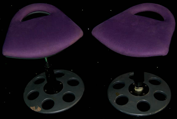 A lot of two prop items featured variously throughout 24th century Star Trek episodic television. This consists of two stools with a vaguely bell-shaped, purple fabric seat, a hole cut out near the end to cushion the lower back; a metal, adjustable stand, and decorative black, plastic base. The item … |