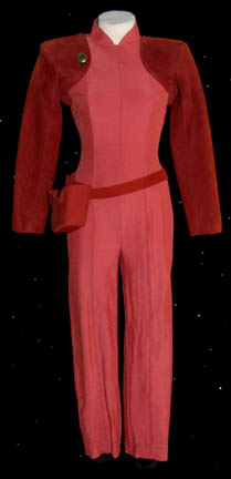 “Kira Nerys” (Nana Visitor) was a Bajoran female who was a Colonel in the Bajoran Militia and later a Bajoran liaison officer on Deep Space Nine. Her Bajoran uniform is a rose color jumpsuit with suede rust color shoulders and sleeves. The suede is stitched with black thread in a … |