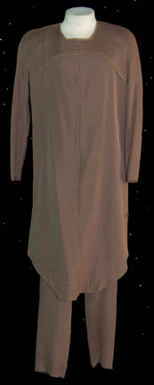 This costume was featured in the Star Trek: Deep Space Nine episode “Q-Less”. It includes a patterned top using earth tone and copper colors with ribbed and wavy fabric piping around the bottom. A matching removable ribbed shoulder cape is worn over the top with terracotta color pants completing the … |