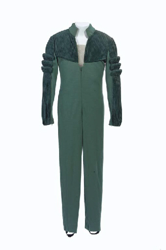A green jumpsuit with green dyed leather shoulders and sleeves, label inside inscribed <I>Star Trek TNG</I> -- worn by Kirsten Dunst as Hedrel in "Dark Page" in <I>Star Trek: The Next Generation</I>; with corresponding wardrobe tag |