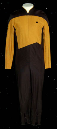 A Starfleet uniform made in the style of Star Trek: The Next Generation featuring the black shoulders with a operations gold chest and back and black waist and legs that end in stirrups. This style also exhibits the Mandarin collar common to cast members during and after the third season … |