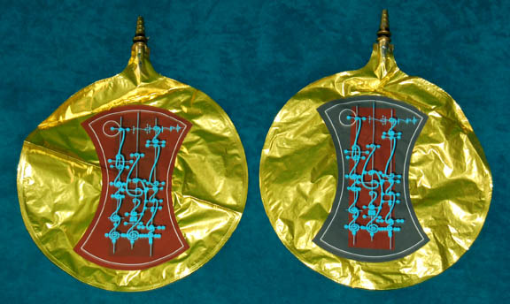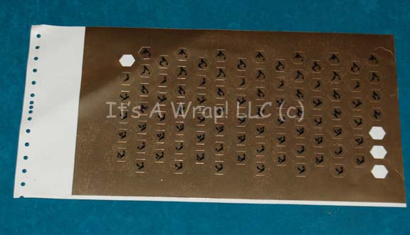 A sheet of unused Son’a themed console button applications like those featured in Star Trek IX: Insurrection. The item is a sheet of white paper with removable metallic gold colored applications made to fit on the top of hexagonal dial buttons. The applications all feature black colored silk-screened Son’a iconographic … |