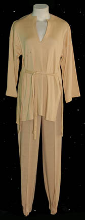 A costume featured in Star Trek I: The Motion Picture, tan colored trousers and a matching long sleeved shirt with a waist tie and a ribbed v-neck, the item features a Western Costume Co. tag and is intended for female actors. |