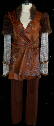 This costume was worn by a “Rigellian” male in the Star Trek: Enterprise series premier “Broken Bow”. The long sleeved jumpsuit is dark gray on the bottom half with light gray arms, shoulders and upper chest. There are three red leather strips on each side, a red leather collar and … |
