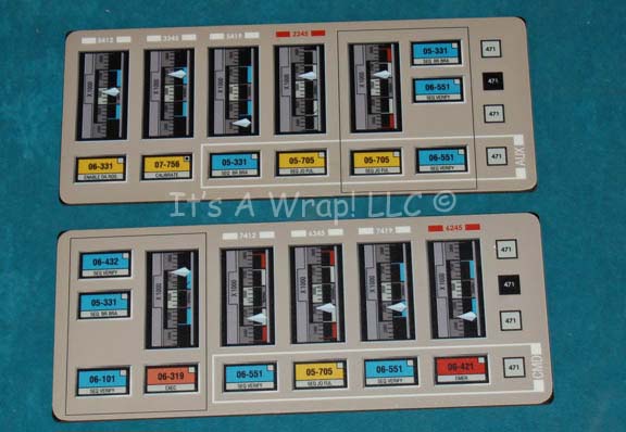 A pair of faux instrument boards made for scenes in various episodes of Star Trek: Enterprise. The items composed of sheet plastic with rounded corners and graphical applications adhered to their faces. The items depict multi-colored indicators and statically positioned gages. The indicators are labeled ‘CMD’ on one item and … |