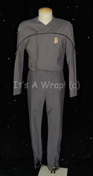 A full–length gray Starfleet uniform jumpsuit made in the style of “All Good Things…”, the final episode of Star Trek: The Next Generation, to exhibit the future styling of Starfleet uniforms. This costume was featured in the final episode of Star Trek: Voyager, “Endgame”. It features black elastic stirrups at … |