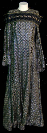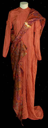 A costume dress featured in the Star Trek: Deep Space Nine episode “Rivals” for wear by “Roana” (Barbara Bosson) a Bajoran woman conned into opening a casino for “Martus Mazur” (Christopher Saranden) to run in competition to “Quark's”. The costume is a long dress, black with gold geometric and vine … |