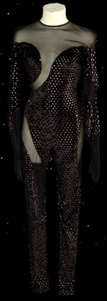 A costume featured in the Star Trek: Deep Space Nine episode “Rivals” for wear by actors portraying game dealers in the rival casino to ‘Quarks' on “Deep Space Nine”, ‘Club Martus’. The costume is made up of a black sequined pantsuit with see-though mesh across the shoulders and between the … |