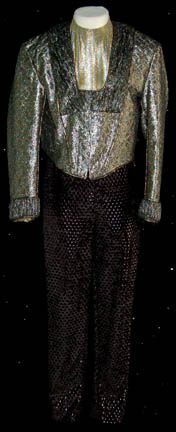 A costume featured in the Star Trek: Deep Space Nine episode “Rivals” for wear by actors portraying game dealers in the rival casino to ‘Quarks' on “Deep Space Nine”, ‘Club Martus’. The costume is made up of a black sequined jumpsuit with a shiny gold and silver striped top and … |