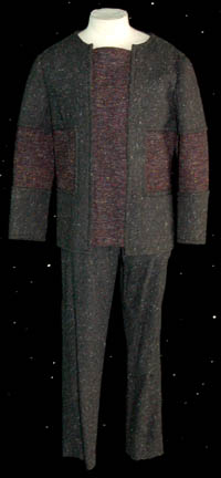 A costume featured in various Star Trek: Deep Space Nine episodes for wear by actors portraying Cardassian civilians and officials. Made up of grey trousers with a matching neoprene top, the costume comes with a costumer's tag reading ‘Mark Ricardi’. |