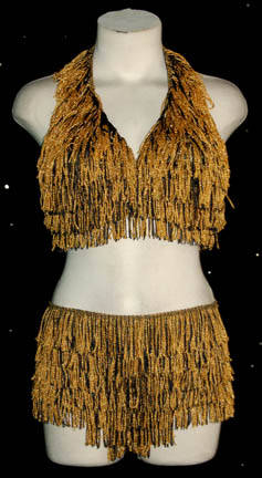 Being a 1960's jet setting international super spy means at least as much pleasure as business, even in the holodeck. For “Special Agent Julian Bashir” (Alexander Siddig) it means interacting with Russian counter intelligence agents, hit men, and go go dancers. This costume is a two piece gold fringe pantie … |