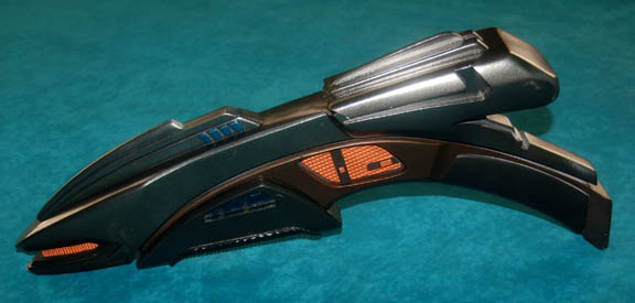 A high quality cast resin prop Ferengi disruptor carbine featured in various Star Trek: Deep Space Nine episodes like “The Magnificent Ferengi”. Painted metallic pewter with orange and teal accents, the item features alien character letters etched into the sides. Item measures approx. 18.25 X 8.5 X 3 inches. |