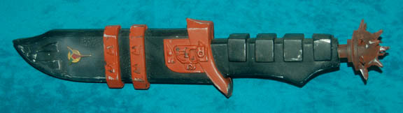 A molded rubber faux prop knife painted black with rust colored painted accents and bendable metal wire costume attachments. The item features a glazed painted metal red, blue, and green Klingon emblem affixed to it and the item measures approx. 14 X 2.75 X 2.25 inches. |