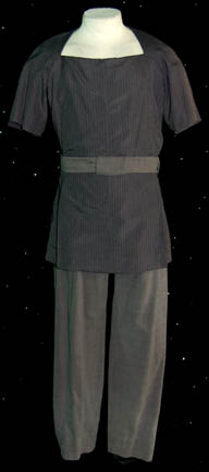 A costume featured in the Star Trek: Voyager episode “Alliances” for wear by a ‘Kazon-Pommar' composed of thick gray pants with a matching gray top with a quilted geometrically patterned design. A sewn in Enterprise tag reads ‘Pablo Soriano’ indicating wear in the “Enterprise” episode “Damage” where it would have … |