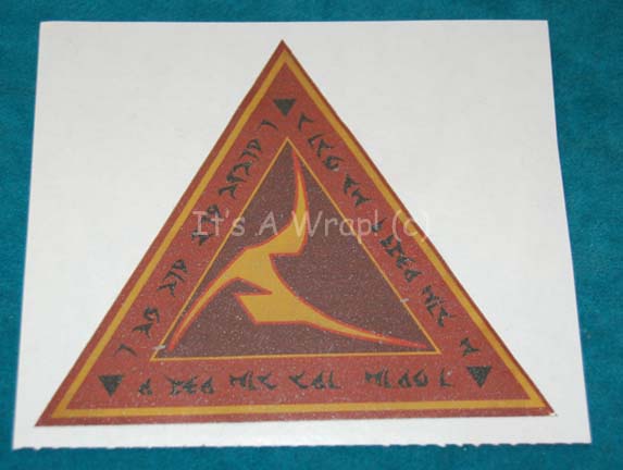 A screen used Klingon themed graphical application like those appearing on Klingon based sets in various episodes of Star Trek: Enterprise like “Sleeping Dogs”. The item is a triangle shaped label with an adhesive backing, the face features a large Klingon iconographic letter centered with Klingon language wording on each … |