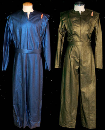 A pair of reflective costumes featured in the Star Trek: Voyager episodes “Workforce: Parts I and II”. The costumes are a size 46 blue vinyl jumpsuit for a male wearer with an orange ‘Quarran' patch on the left shoulder and a green colored size 8 woman’s costume with a similar … |