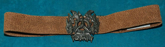 A Klingon belt made for wear during the filming of Star Trek episodic television. The belt is made of brown leather over a woven base with a Velcro fastening in the back. The impressive buckle is made of metal with the Klingon emblem in the center and Klingon text underneath. … |
