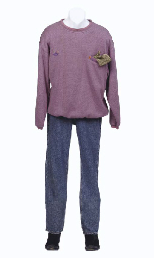 A lavender sweater, scarf, and blue jeans with belt and boots -- worn by DeForest Kelley as Dr. McCoy in the campfire scene at the end of <I>Star Trek V: The Final Frontier</I>, with corresponding wardrobe tag (5) |