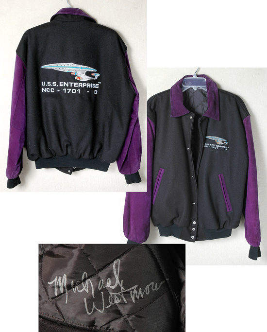 Black and purple felt crew jacket, size L, with two colored images of the spaceship with "U.S.S. Enterprise NCC - 1701-D" embroidered below, one on the front left chest area and a large one across the back. Michael Westmore signed in silver marker above the inside, right pocket. The jacket … |