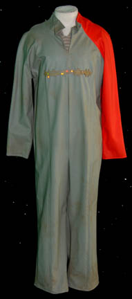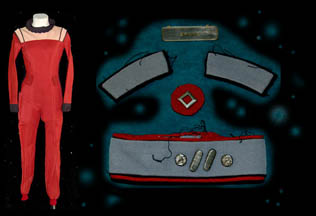 A Starfleet uniform jumpsuit appearing in various Star Trek feature films. The costume is a red jumpsuit with a tan shoulder and chest, a ribbed collar and cuffs, both black indicating the wearer to be a crewman, with an unattached blue-gray colored division strip with affixed silver colored metal badges, … |